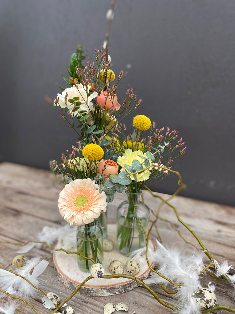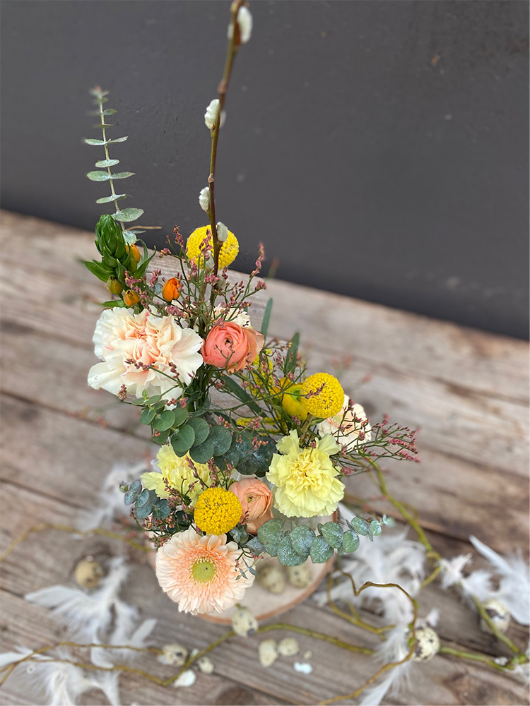 Een houten boomschijf, 3 vaasjes met fleurige bloemen, enkele krulwilgtakjes, pluimpjes en eitjes om het af te werken.